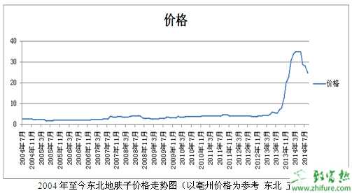 主产区东北哈尔滨郊区一直都有种植铁扫帚的习惯,铁扫帚是扎扫帚的原材料,当地和国内一家生产扫帚的厂家签订了种植合同,当地铁扫帚种植 得到全面发展,地肤子作为铁扫帚原料的种籽,产量也逐年增加。随着城乡建设的快速发展,用铁扫帚制成的扫帚使用率越来越少,很多都被同等的产品替代了,就 这样铁扫帚销售不出去,地肤子又常年低价,当地农户都是亏本种植,种植积极性极大受挫,加上当地同签订种植合同的厂家合约在2010年到期,因此当地地肤 子种植面积每年调减,2011年的种植面积较2010年缩减40-50%,2012年又在2011年缩减50%的基础上再次缩减50%,当时产地及市场商 家普遍认为,2011年就应该涨价的地肤子2012年行情应该如心所愿,但事与愿违,2012年地肤子的行情仍然在4元上下徘徊,一些存货的商家也没有了 囤货的信心,在2013年上半年纷纷出售了手中的货源,产地库存逐渐消化。然而老天总喜欢和人开玩笑,2013年在低价的影响下,面积继续缩减,但当年逢 雨水多原因,使得严重减产,产新期货源紧张,加上有药商看好此品种在背后推波助澜价格出现“天价”,地肤子的价格从7月的5.5元直线上升到年底的23元 上下,2014年继续上涨,到下种时维持在33元上下的高价,在高价的刺激下,2014年的种植面积增加,5月开始价格出现回调到28元上下,6-7月 24元上下,8月20元上下,现产地新货已经上市销售,亳州市场含潮货价格已落到17元上下。
