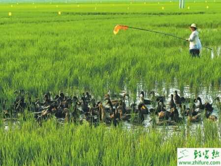 8、结合治虫进行放鸭。先摸清虫情,如虫害较重时,减少补料,让鸭处于半饥饿状态,大量采食害虫,充分发挥防治害虫的目的。